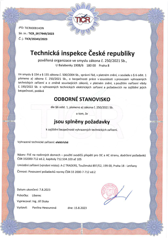 Aufgrund der spezifischen Konstruktion und Lage ist es notwendig, nach jeder Unterbrechung der integrierten Sicherung (aufgrund der Wirkung des SPD) den Reststrom bei der maximalen Betriebsspannung zu messen.