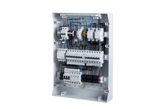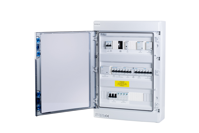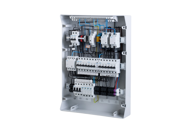Schalttafel EATON IKA-3/54-ST, Überspannungsableiter EATON SPBT12-280/4 Klasse T1+T2, Hauptschalter EATON IS40/3, Vorbereitung für Kesselschutz – EATON PL6-B16/3, Schutz des Wechselrichters und der Backup-Stromkreise 2x EATON PL6-B20/3, Schütz inkl. Überwachungsrelais ELKO HRN-55 und Schütz EATON Z-SCH230/40-40, Schutz für Messung und Steuerung, Leistungsschalter EATON PL6 und 2 Schütze zum autonomen Umschalten des Objekts auf Backup Z-SCH230/25 + Relais zur Steuerung des Notfall-HDO.
