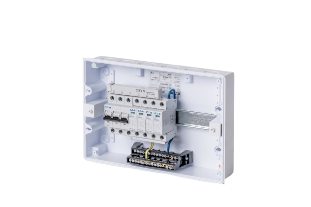 Geeignet zur Kombination mit den Schalttafeln R-FVE-DC1, R-FVE-DC2 für den DC-Teil der Anlage und R-FVE-M5+P3F für Backup-Stromkreise mit manuellem Schalter (Wechselrichter-Bypass) und Leistungsschalter oder R-FVE-Z3 mit Fehlerstrom-Schutzschalter, Steckdosen und Sicherung.