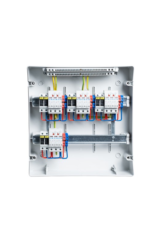 Die Schaltanlage ist mit DC-Überspannungsableitern – T1+T2 – und Sicherungslasttrennschaltern einschließlich gPV-Sicherungen zum Schutz des DC-Eingangs des Wechselrichters ausgestattet.